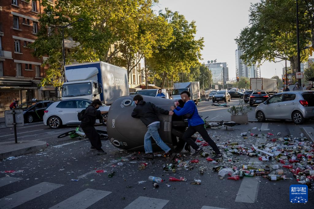 9月10日,在法国巴黎街头,者用垃圾桶封锁道路。新华社发(奥雷利安莫里萨尔摄)